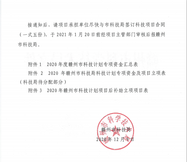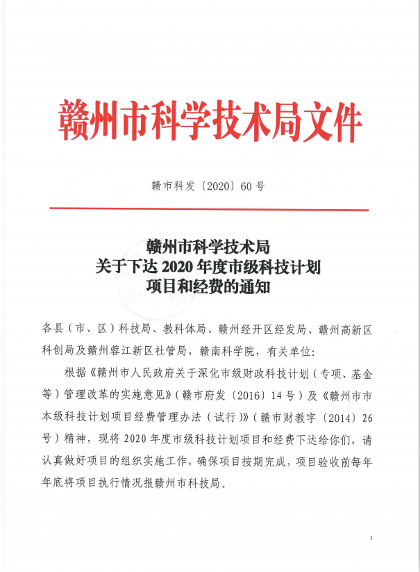 赣州市科技计划项目是赣州市政府为全面实施创新驱动发展战略,大力推进科技协同创新及产业转型升级,为赣南苏区振兴发展提供科技支撑的重大举措。赣州市科技计划项目面向范围广泛,很多赣州市高校、研究院和高新企业同台竞争。科研处将按照相关项目管理办法,认真开展研究工作,保质保量完成预期研究成果,顺利通过验收。
