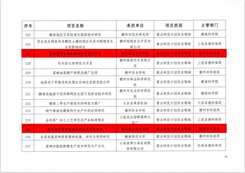 近日,从赣州市科技局下发的《赣州市科技局关于下达2020年度市级科技计划项目和经费的通知》(赣市科发〔2020〕60号)获悉,我院动物科学系吴辉生同志主持的《富硒湖羊生物发酵饲料研究与开发》和李淑云同志主持的《赣州地区富硒蜜源的研究及开发利用》喜获2020年赣州市科技计划项目重点研发计划农业领域后补助项目立项。