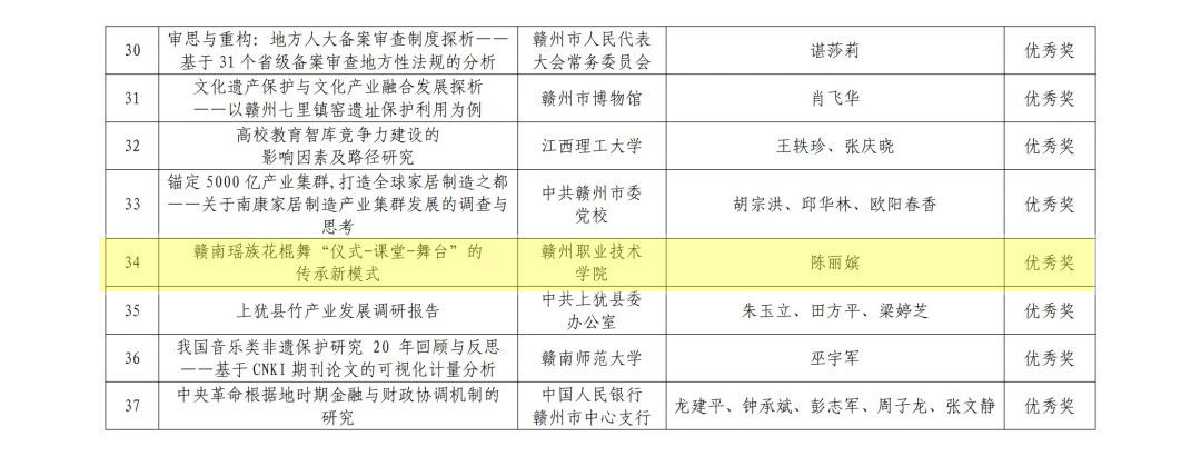 近日,赣州市2022年度社科优秀成果奖评审结果揭晓,我院教师陈丽嫔《赣南瑶族花棍舞“仪式-课堂-舞合”的传承新模式》荣获论文类优秀奖。
