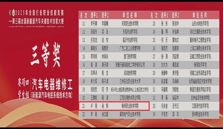 12月5日-8日,以“绿色赋能·联动未来”为主题的第三届全国新能源汽车关键技术技能大赛决赛在广西壮族自治区柳州市顺利结束,由明建平老师指导汽车工程系学子卢阳、肖辉参加汽车电器维修工(新能源汽车电控系统技术方向)学生组赛项,通过江西省选拔赛进入全国决赛,在全国68支决赛队伍中以第21名的成绩荣获三等奖。