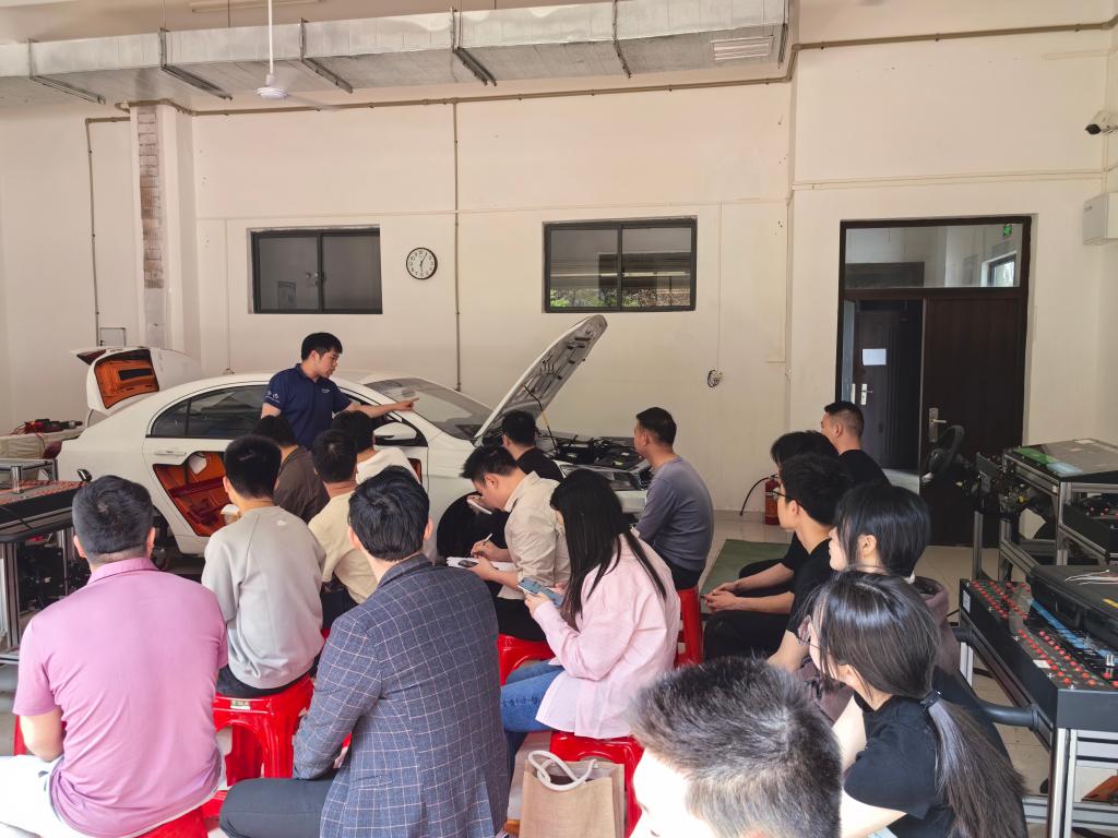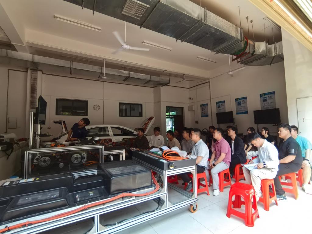老师和学生们根据前面工程师的讲解和演示,开展实践操作及交流讨论;师生组队分别对新能源汽车车身模块、充电系统、动力驱动模块、高压电池模块、空调系统模块、转向操作系统模块等开展多个核心项目实操,参与的老师和学生们边操作学习边记录数据,有不清楚的及时咨询在场的工程师或者其他老师。