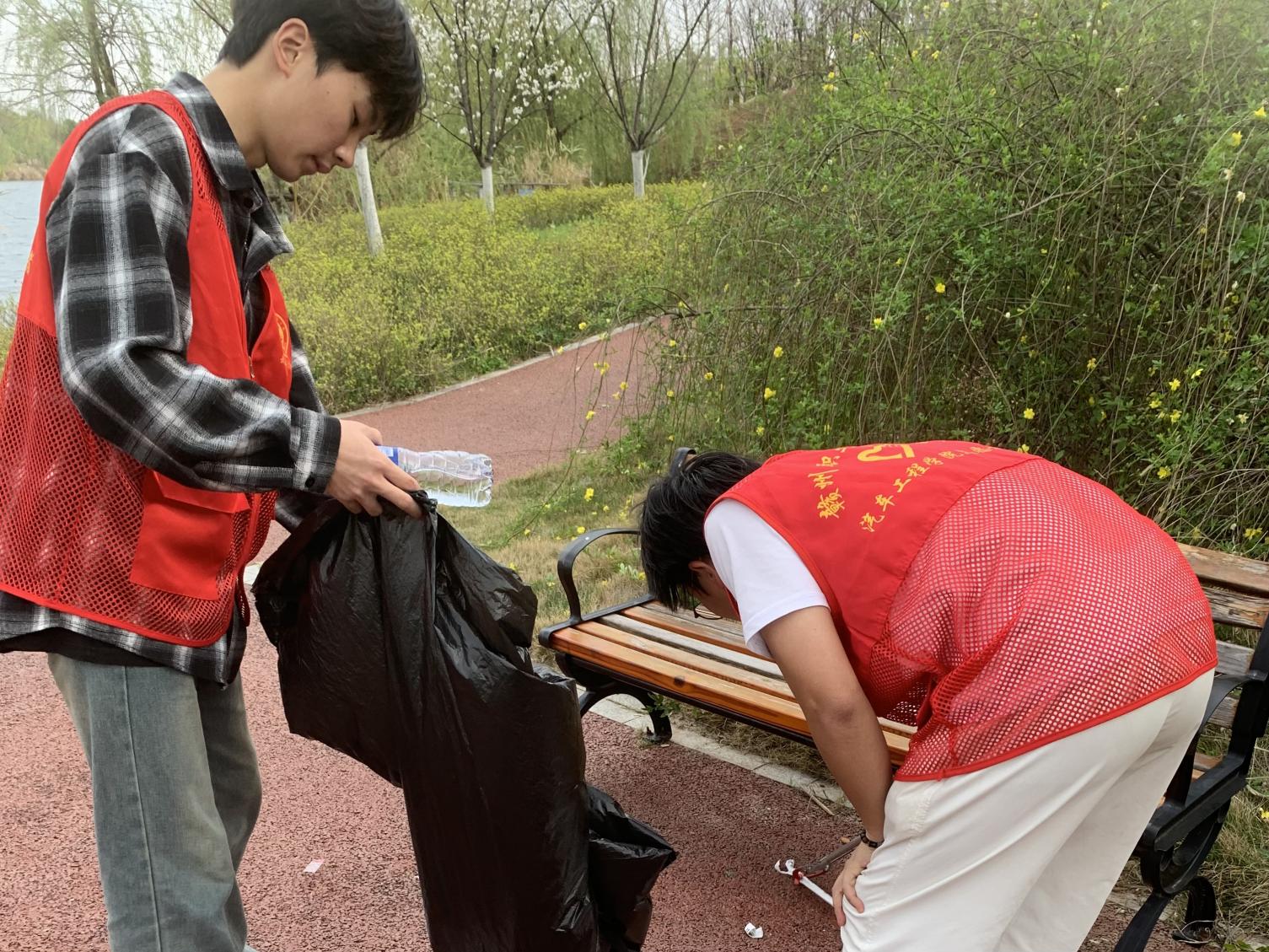 15:30分,志愿者们抵达唐龙公园,他们手持垃圾夹手拿黑色塑料袋沿着唐龙河沿展开展行动,草丛中的塑料瓶,草地上的烟头,水中漂浮的塑料包装袋一一拾起,放入垃圾袋中。河畔步道上,志愿者两人一组分工合作,一人清理、一人收集,将垃圾分装入垃圾袋中。经过2小时的努力,累计清理河道2公里有余,河岸环境焕然一新。