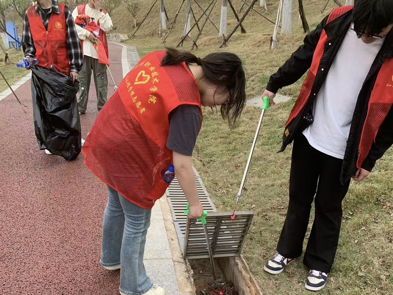 在活动中,尽管天空突降小雨,但丝毫不影响志愿者们的热情,仍投入到工作中,用实际行动投身到“河小青”护河活动中去。活动接近尾声,志愿者将将清理的垃圾集中放入垃圾箱中,汗水和雨水湿了红马甲。