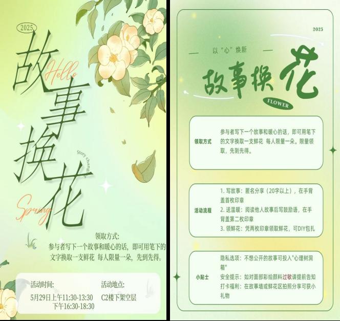 5.活动内容:在二食堂后侧设置留言板写下自己的故事(社恐可勾选匿名模式),写一句回应别人或鼓励自己的话,由志愿者在手背盖上“故事印章”,将话贴在展板上,凭印章用旧报纸、透明袋、丝带等材料动手包扎花束兑换鲜花。
