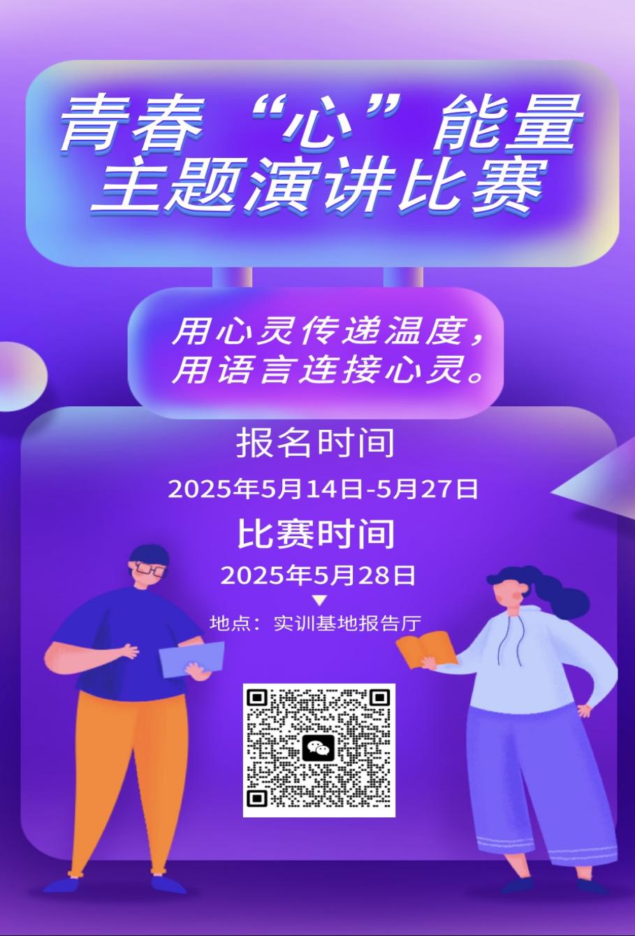 6.活动内容:大赛以青春“心”能量为主题,要求参赛者准备关于心理健康的演讲稿,内容包括压力管理、情绪调节等。演讲需具感染力,提出实用建议,并可使用PPT、视频等助手段。专业评委团将根据内容、表达、台风、时间控制度等标准评选出一、二、三等奖,快扫码进群报名吧,相信下一个心理“嘴强王者”就是你!